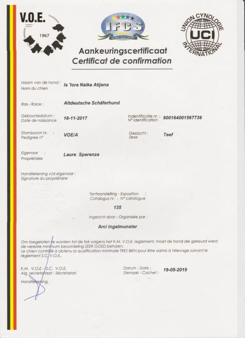 Naïka vient de Pologne de l’élevage d’Altdeutsche Schäferhund – berger allemand ancien type de Béata Kazmiesky Scrato Z Nysy. Dès la première minute elle savait qu’une nouvelle vie commençait pour elle. Aussitôt arrivée, elle a pris sa place au sein de la meute avec aisance sans timidité et très déterminée pour son jeune âge.